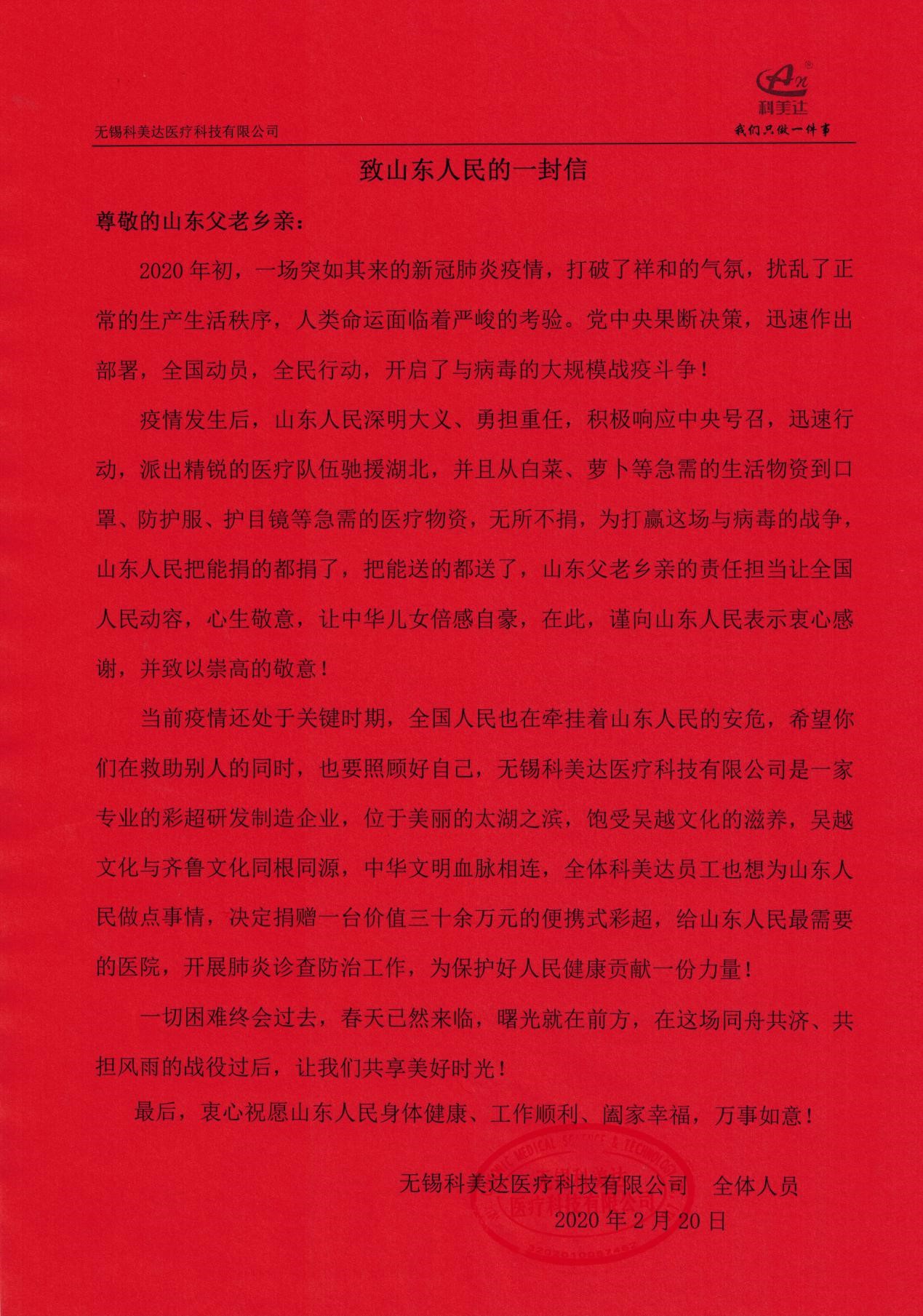 庚子年初,新冠肺炎疫情洶涌而來,隨著鐘南山院士馳援武漢指出新冠肺炎存在“人傳人”的現象,一場史無前例的疫情攻堅戰(zhàn)在全國打響。武漢告急,全國馳援,從生活物資到醫(yī)療用品源源不斷往最需要的地方,山東人民搬家式的支援抗疫模式更是感動了全國人民,彩超作為新冠肺炎病情診斷的重要手段,得到臨床專家的重視,為緩解疫情防控期間醫(yī)療物資緊缺狀況,有效防范醫(yī)護人員感染和疫情擴散風險,科美達公司主動聯系山東省慈善機構,向濟南市鋼城區(qū)慈善總會定向捐贈了價值38萬元的便攜式彩超設備,用于濟南市鋼城區(qū)醫(yī)院抗擊肺炎疫情和人民健康檢查,確保戰(zhàn)略后方穩(wěn)固。